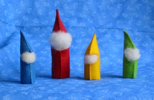 wool felt gnomes stuffed with wool fleece. made from the directions in